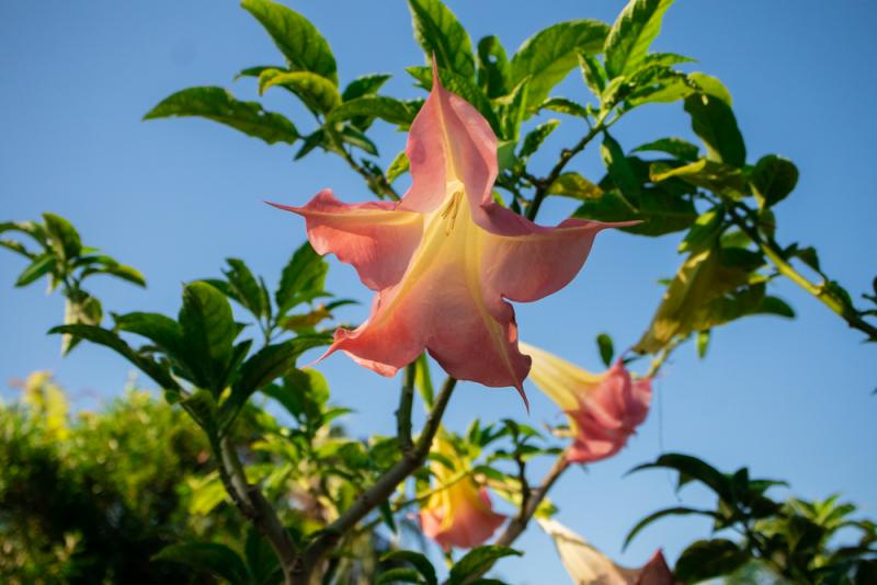 Angel Trumpets come in a variety of bloom colors. They never fail to attract attention with their coarse leaves and huge, bell-shaped, drooping flowers. Some varieties have a sweet fragrance. Plant in the ground using a Success Kit or in large containers with Happy Frog Potting Soil. Fertilize in spring and fall with Espoma Plant-tone.