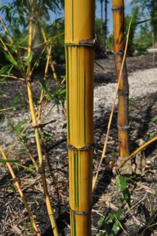 AKA Golden Hawaiian bamboo has 4 inch culms that are bright yellow with green stripes and is cold hardy to 27 degrees. The culms are wide spaced and form fairly open clumps. It is also known as "painted" bamboo. Clumping bamboo spreads outward from a central point and does not spread out of control. Plant in the ground using a Success Kit and fertilize with Harrell's every other month.